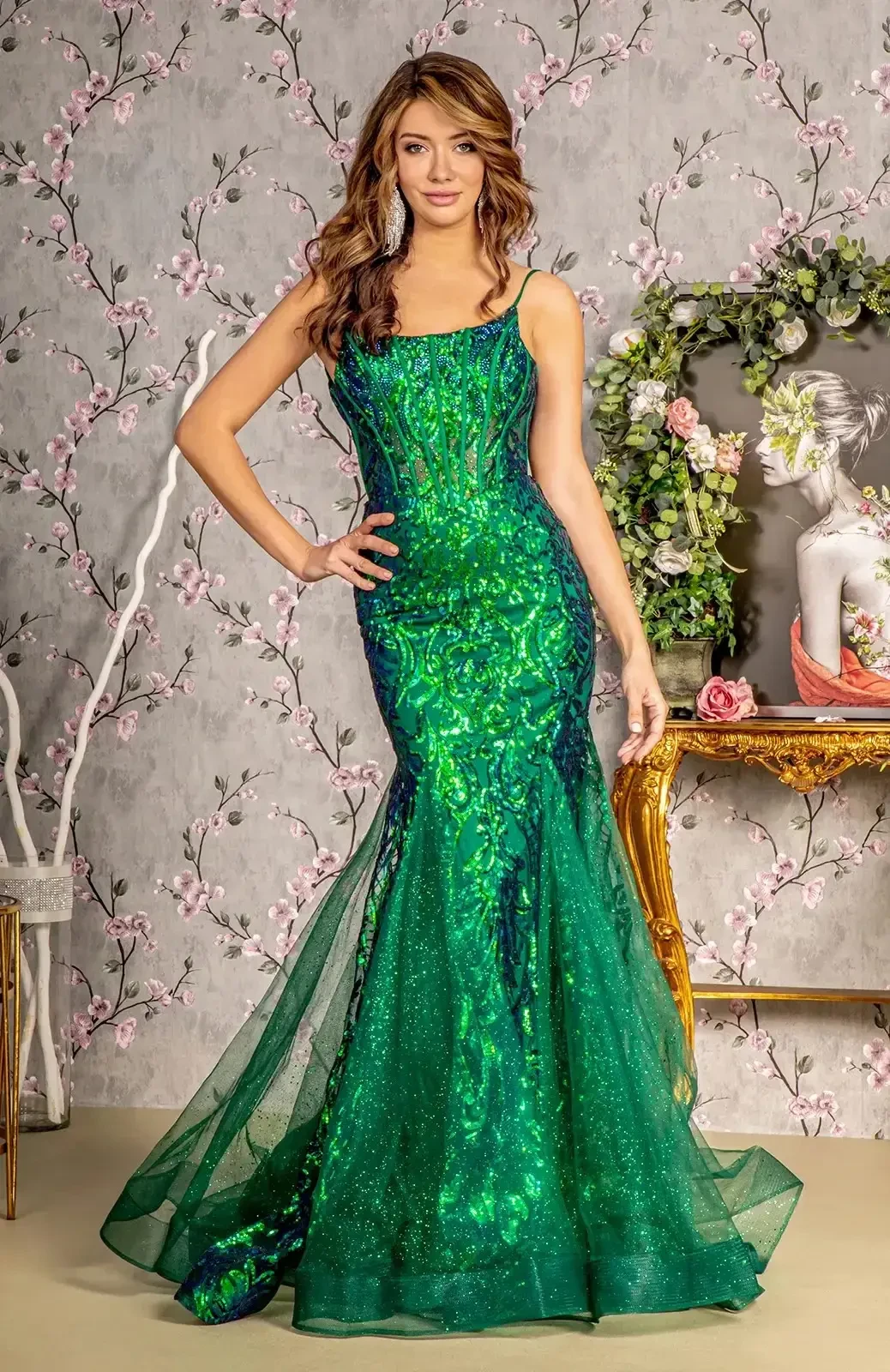 GLS Collective GL3219 – A breathtaking gown adorned with sequins and a figure-flattering cut.